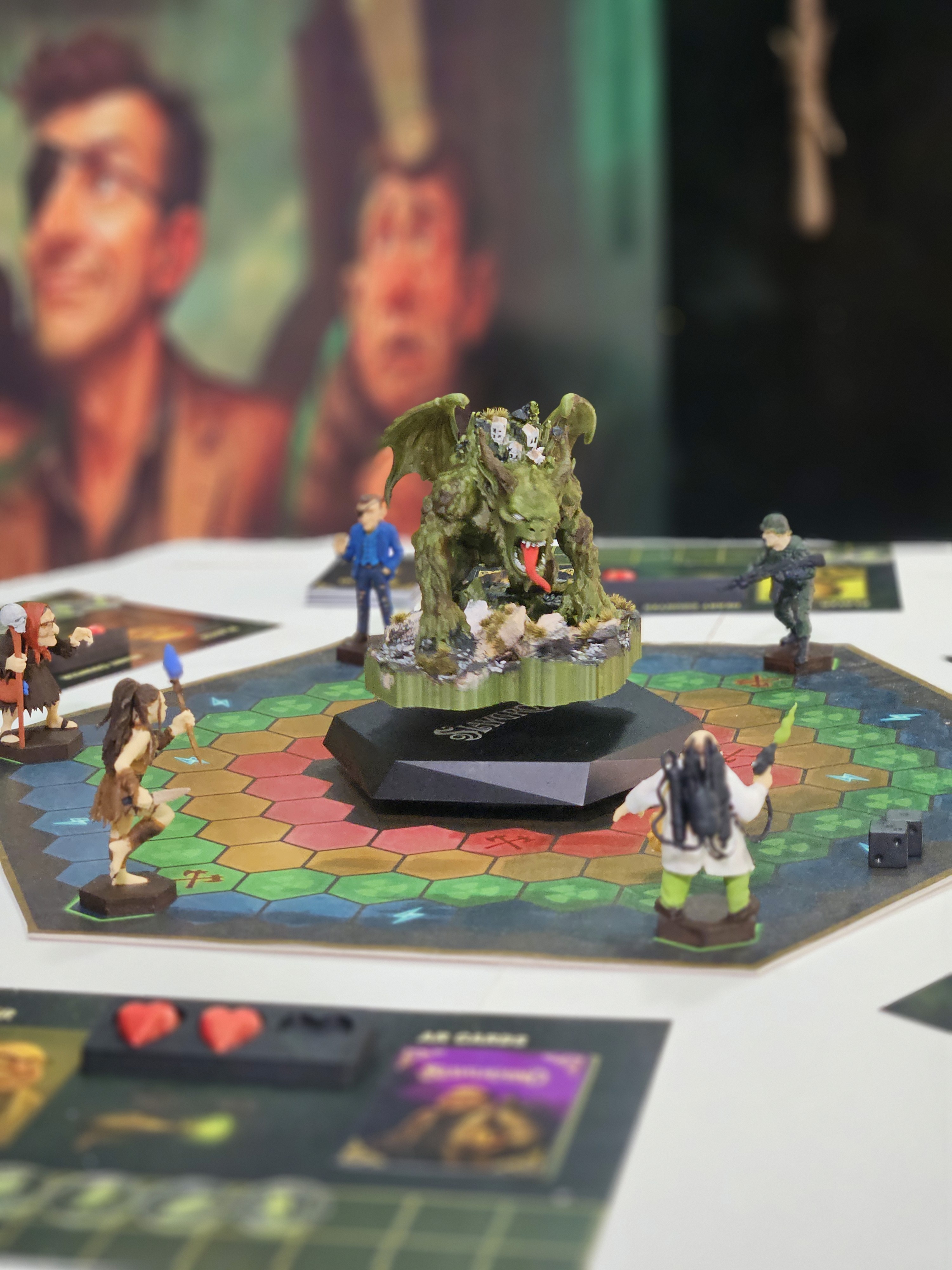 Slayground is a board game set in a world destroyed by a global nuclear war. From the ashes and devastation, a monstrous entity was born — a vast, vengeful being that seems to embody the world itself, rising to punish humanity for its destruction. The few survivors must fight each other and the monster in a desperate struggle for control over what remains.